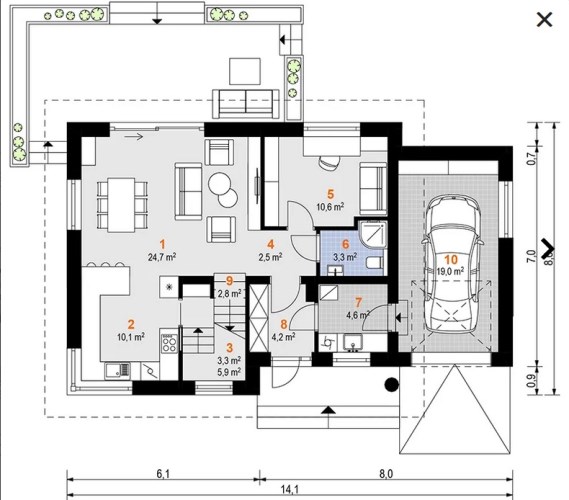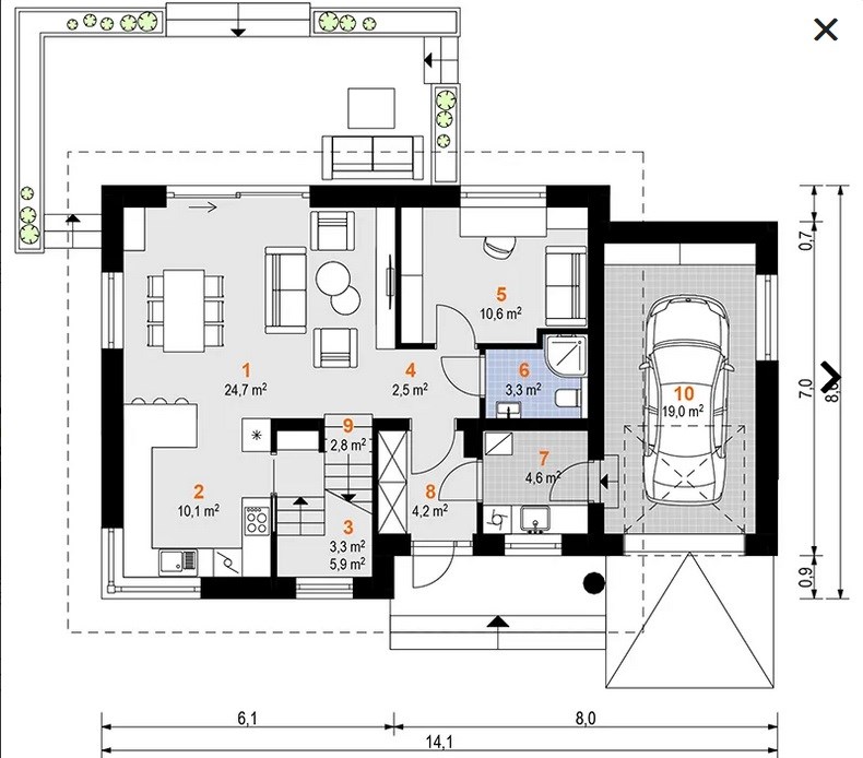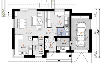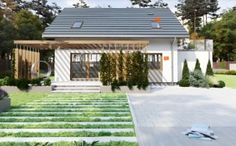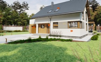 Z opisu projektanta: "Jagoda to uroczy dom z poddaszem użytkowym, który przy stosunkowo niedużej powierzchni oferuje bardzo bogaty program funkcjonalny. Parter to strefa dzienna z otwartą kuchnią i salonem, z którego wyjście prowadzi wprost do ogrodu. Na poddaszu zaplanowano trzy przytulne sypialnie oraz łazienkę. Dołączony garaż w bryle budynku zapewnia wygodę i dodatkową przestrzeń gospodarczą."