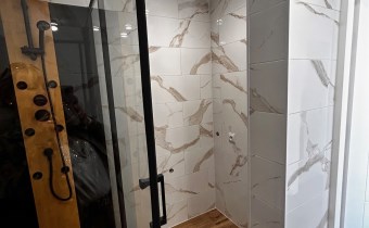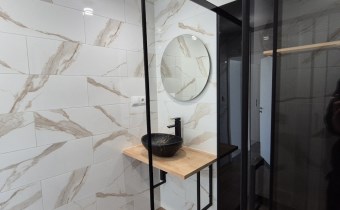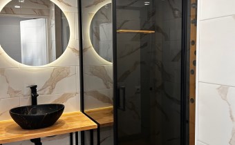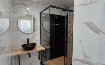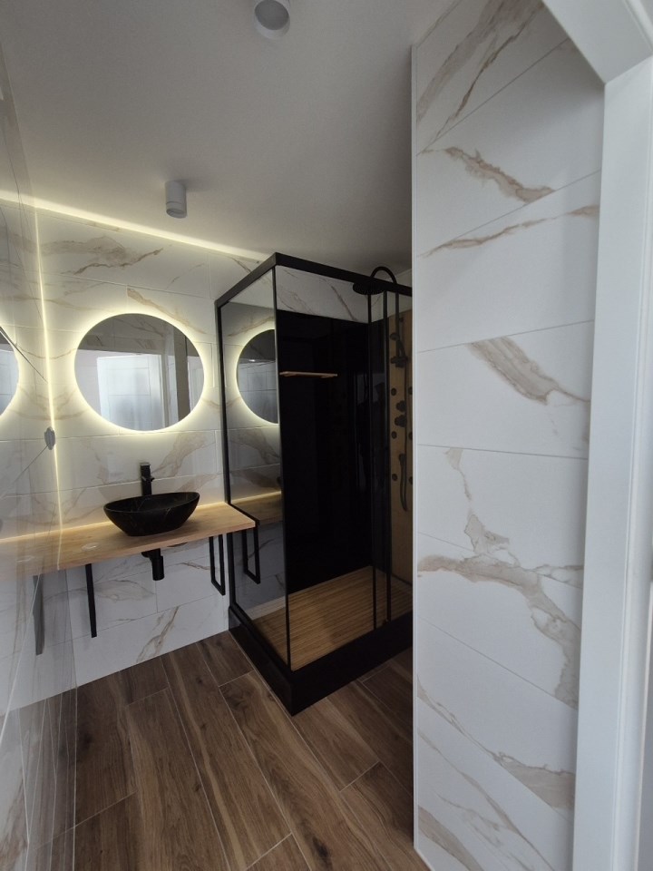 Piękna łazienka z dużą kabiną prysznicową, osobno toaleta.