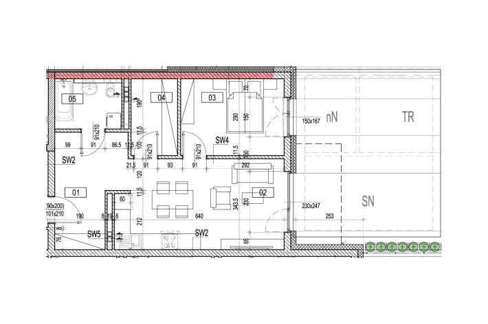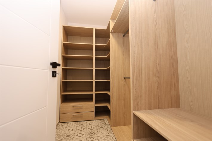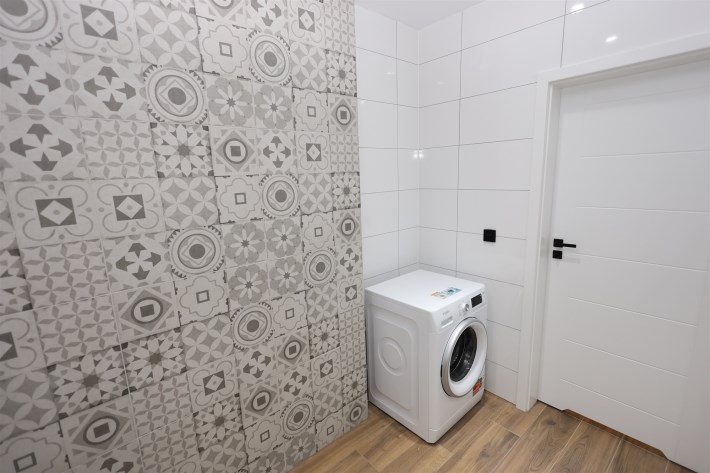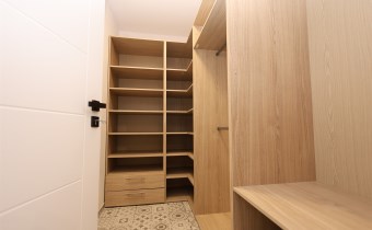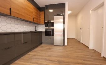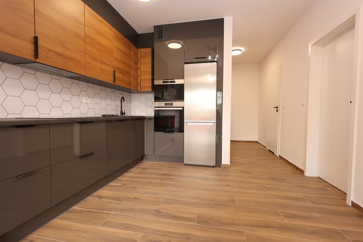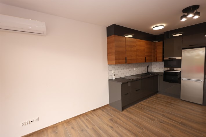 • Przestronny salon z aneksem kuchennym: Idealne miejsce do relaksu i spędzania czasu z bliskimi. Aneks kuchenny jest w pełni wyposażony w nowoczesne meble na wymiar oraz wysokiej klasy sprzęt AGD (płyta indukcyjna, piekarnik, lodówka, zmywarka).