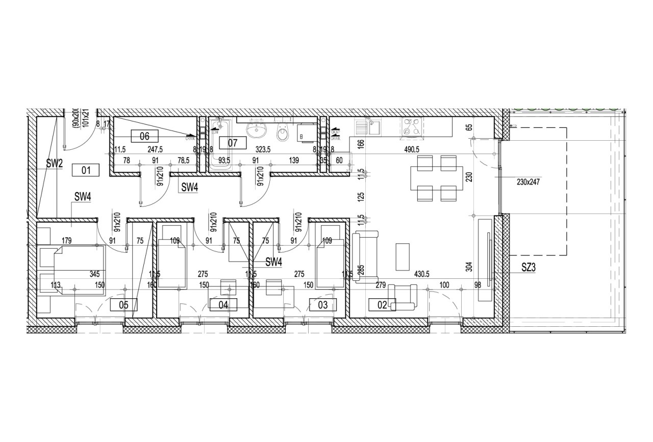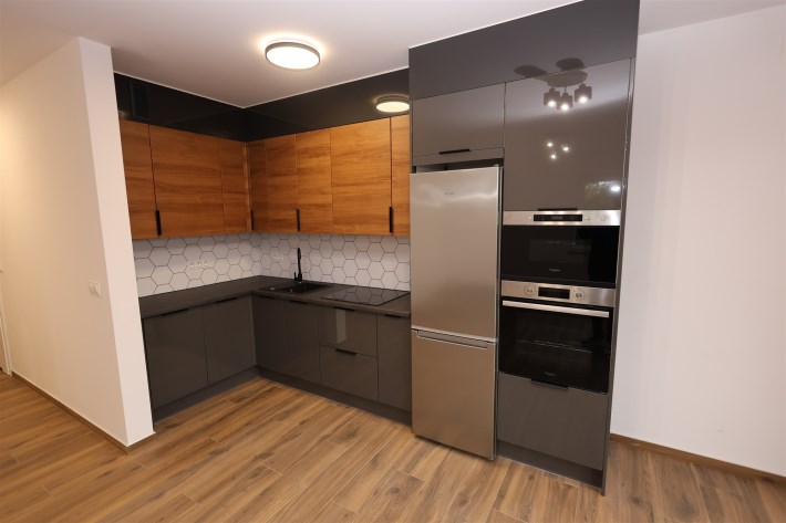 Przestronny salon z aneksem kuchennym: Idealne miejsce do relaksu i spędzania czasu z bliskimi. Aneks kuchenny jest w pełni wyposażony w nowoczesne meble na wymiar oraz wysokiej klasy sprzęt AGD (płyta indukcyjna, piekarnik, lodówka, zmywarka).